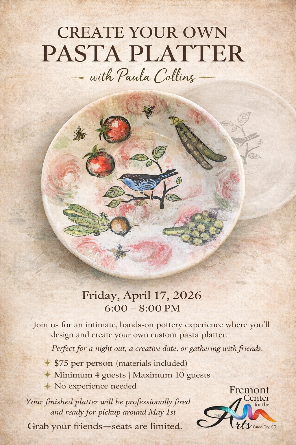Create A Pasta Platter Friday, April 17, 2026 6:00 PM 8:00 PM 18:00 20:00 Fremont Center for the Arts 523 Main Street Cañon City, CO, 81212 United States (map) Google Calendar ICS